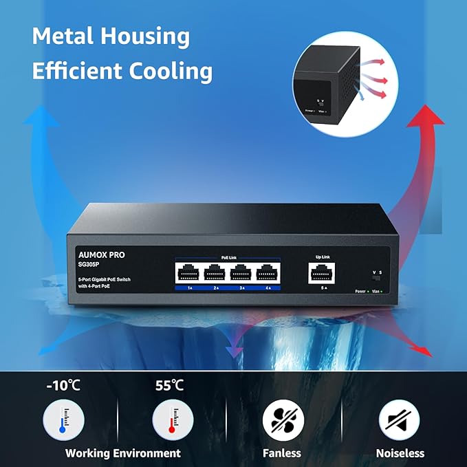 - 【Metal case】AUMOX PRO 4 port PoE switch is protected by high-quality metal casing to ensure a long product life. Having passed an array of stringent reliability tests, AUMOX PRO switch delivers switching performance you can depend on