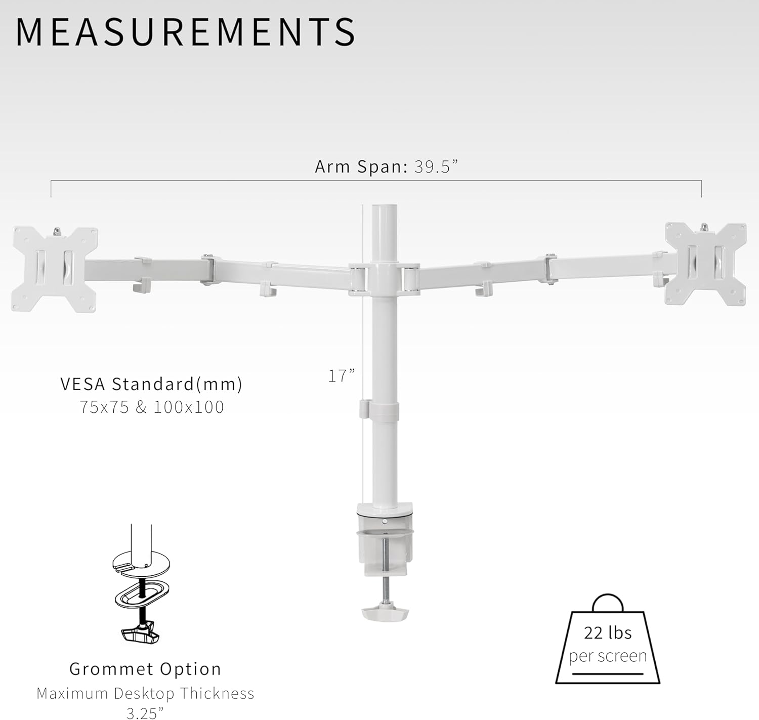 VIVO Dual Ultrawide Monitor Desk Mount, Heavy Duty Fully Adjustable Steel Stand, Holds 2 Computer Screens up to 38 inches and Max 22lbs Each, White, STAND-V038W