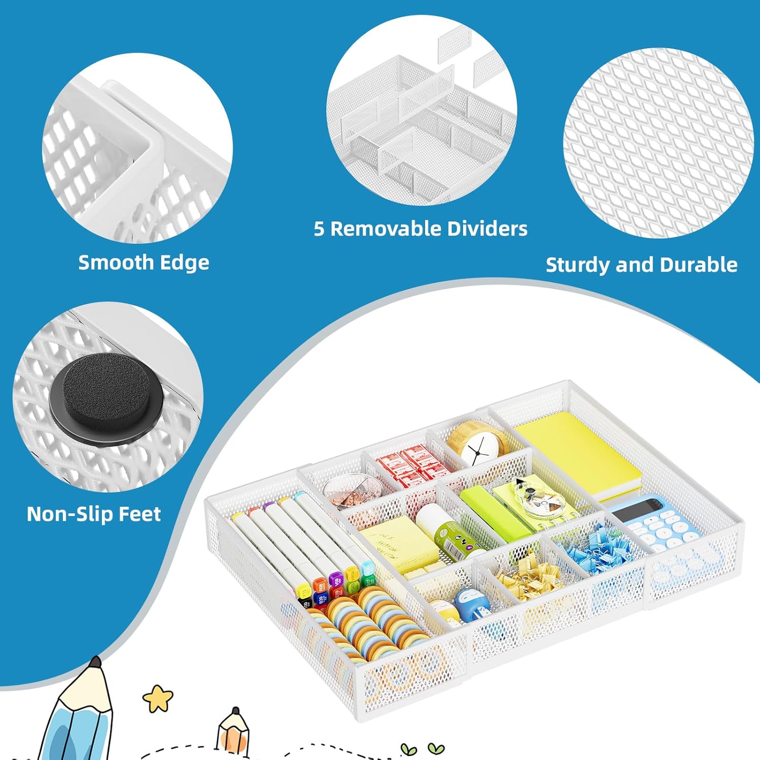 - 【Adjustable Dividers】: Our drawer organizer features 4+1 removable dividers. You would configure the size for fit varisized desk accessories, such as pens, erasers, highlighters, notes, staplers, tapes, clips