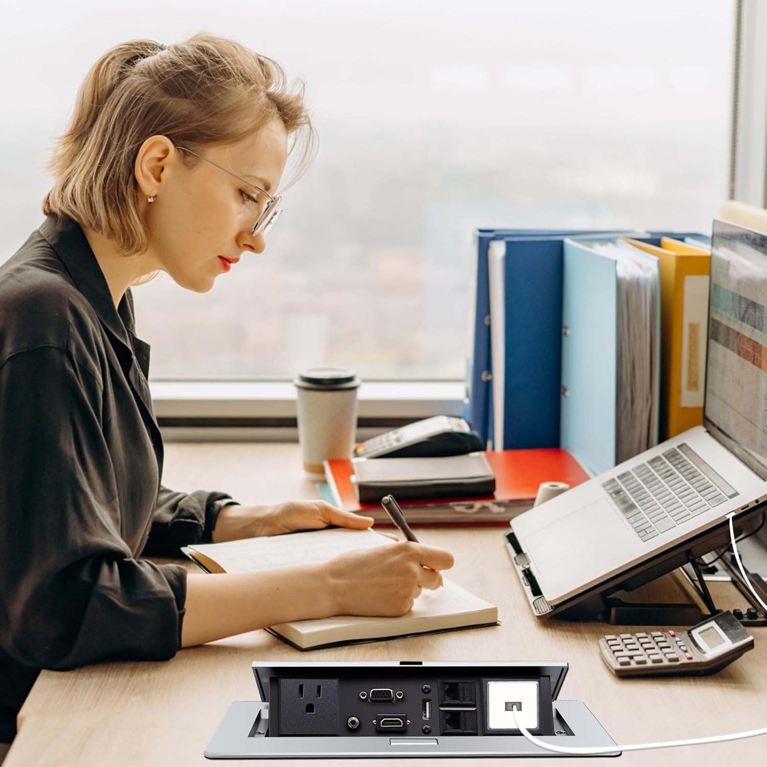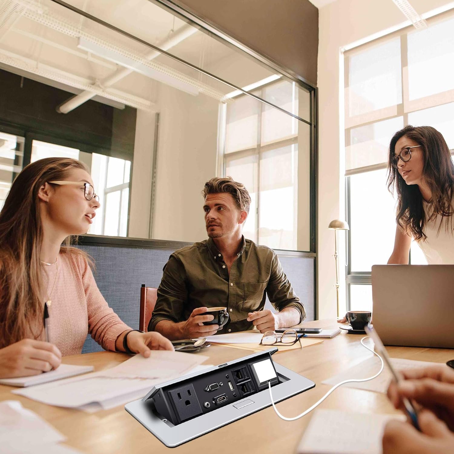 - Pop up Outlet - Made of Aluminum alloy panel, engineering PVC fireproof plastic, durable, and aesthetically pleasing, made of fire-resistant engineering plastic, insulated material box, to prevent electric shock - safety guarantee Suitable for indoor home studios, office meeting rooms, study rooms, multimedia classrooms, hotels and other electrical scenarios