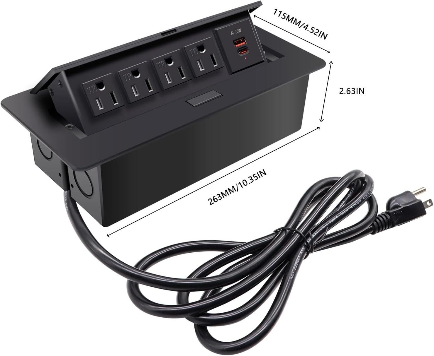 Pop Up Outlet;Pop up Power Strip; Embedded countertop;6.5 Feet 16AWG UL Cable 4 AC Outlets Max Power 1875w USB C PD 20W Fast Charging Used for Home Office Conference, etc (Black)