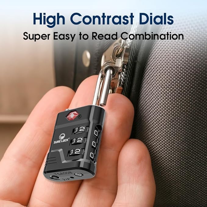 SURE LOCK TSA Locks for Luggage, TSA Approved Luggage Locks with Open Alert, 008 Key for High Security, Easy Read Dials, Zinc Alloy Body, Locker Lock for Suitcase, Gym, Travel. (Black 4 pk)