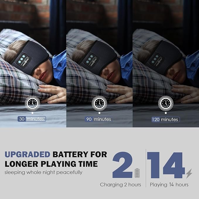 - LONG-LASTING BATTERY WITH TIMER FUNCTION: Equipped with an upgraded 240mAh battery, the sleep mask provides over 14 hours of playtime with just 2 hours of charging; includes a timer function that can automatically turn off after 30-120 minutes, conserving battery life as you drift off to sleep