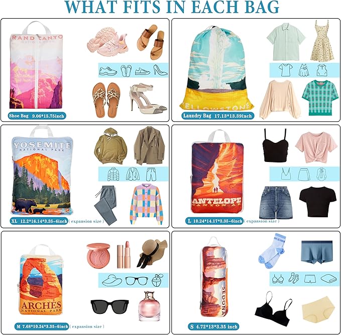 Compression Packing Cubes for Travel, 6 Set National Park Luggage Organizers, Lightweight Waterproof Expandable/Compression Bags Smell Proof Travel Packing Cubes for Suitcases