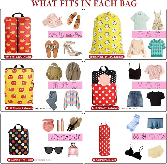 - 6 Packing Cubes: These travel packing cubes help you quickly sort items and keep everything organized! XL cube organizer (12.2"x16.14"x3.35"), L (10.24"x14.17"x3.35"), M (7.68"x10.24"x3.35"), S (4.72"x13"x3.35"). There is also a shoe bag (9.06"x15.75") and a laundry bag (17.13"x13.39").