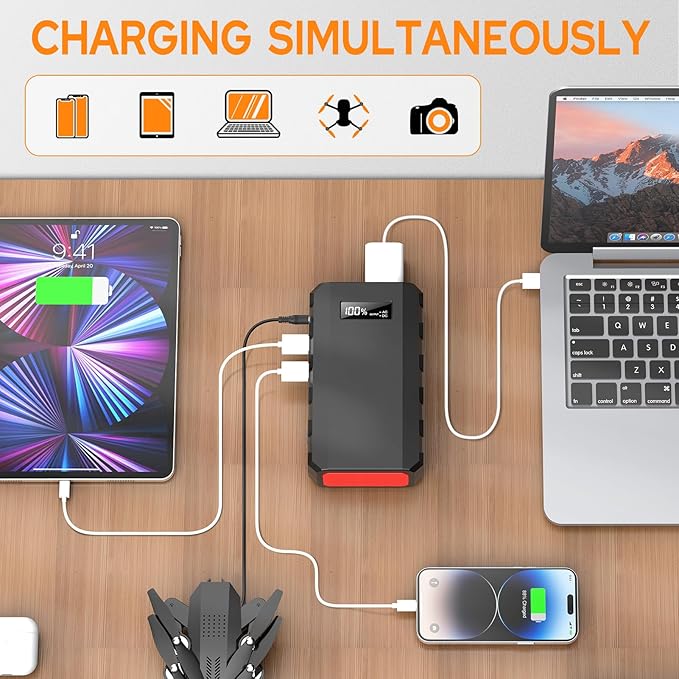 - Universal Charger: Our product includes QC3.0 9v/2A and 5V/3A two USB outputs, one 110V AC outlet, one DC 9~12.6V/10A (Max) output, which means this charger can power your multiple devices at once. It can charge your iPhone and Galaxy up to 8 times, or 2 times for your 12'' Macbook