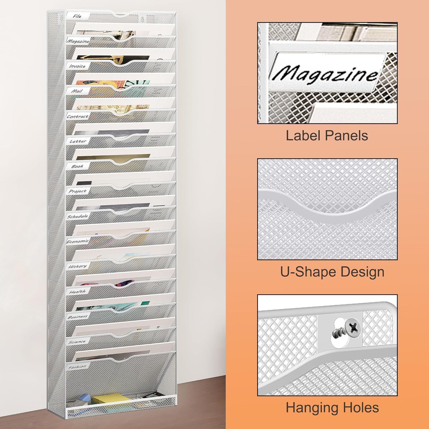 - Thoughtful Design: U-shaped structure allows easy access to desired items from the wall file holder, labeling strips on the edges for quick sorting, smooth edges to ensure that you won't scratch your hands, say goodbye to cluttered desktop and hello to a tidy life