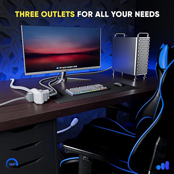 - 360° Rotating Flat Plug – Space-Saving & Flexible: Easily plugs behind furniture, appliances, or in tight spaces. The low-profile rotating plug adjusts to any angle to avoid bending or damaging cords.