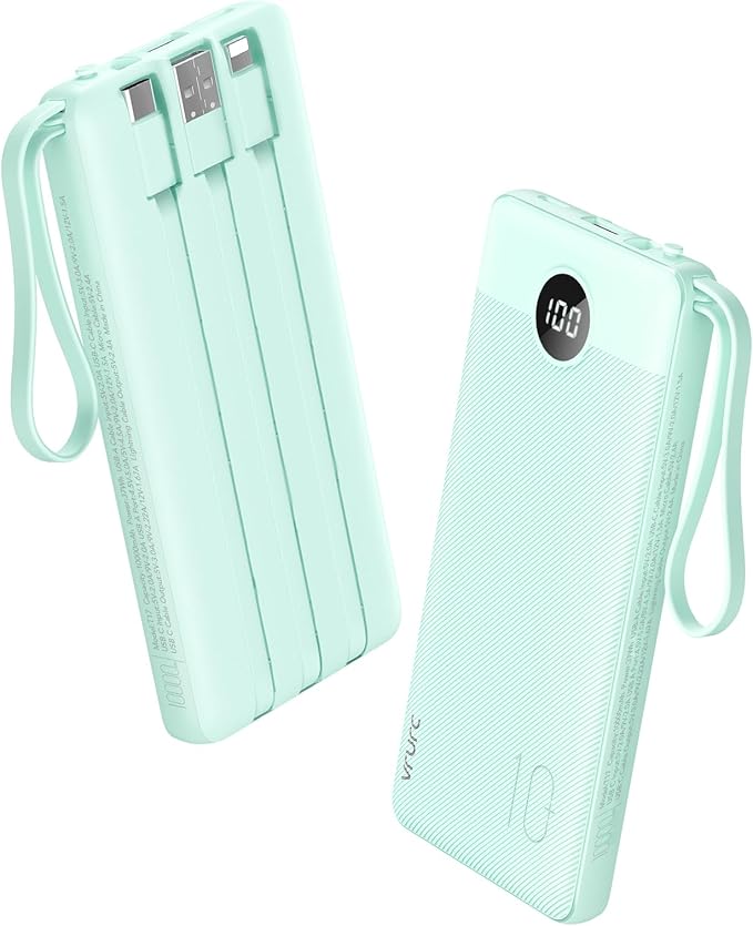 VRURC Portable Charger, 22.5W Power Bank 10000mAh, USB-C Cable in & Out Fast Charging Battery Pack, Compact Travel Essential 4 Outputs 3 Inputs for iPhone 16 15 14 13,Samsung, Android etc-Green