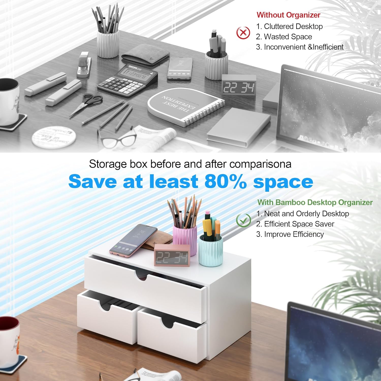 - Eco-friendly Bamboo Material: The desktop storage is made of 100% natural bamboo, providing an elegant solution for storing mail and various desk accessories. The stackable design allows for tidy organization, making your life easier.