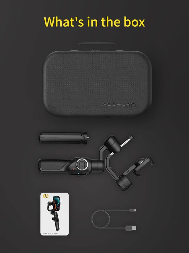 - Universal Compatibility: Smart S2 gimbal effortlessly pairs with a wide array of smartphones. It's engineered to seamlessly support both iPhone and Android devices within dimensions of 6.3 inches in length, 3.5 inches in width, and 0.4 inches in thickness and weighing 0.62 pounds. To confirm the compatibility of gimbal with your phone, simply search for our "AOCHUAN" app on your Apple or Google store. This app unlocks a myriad of functionalities such as Hitchcock, Inception, slow motion, time lapse, panorama, and more for an enhanced shooting experience