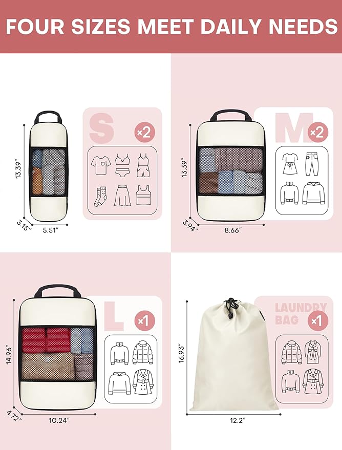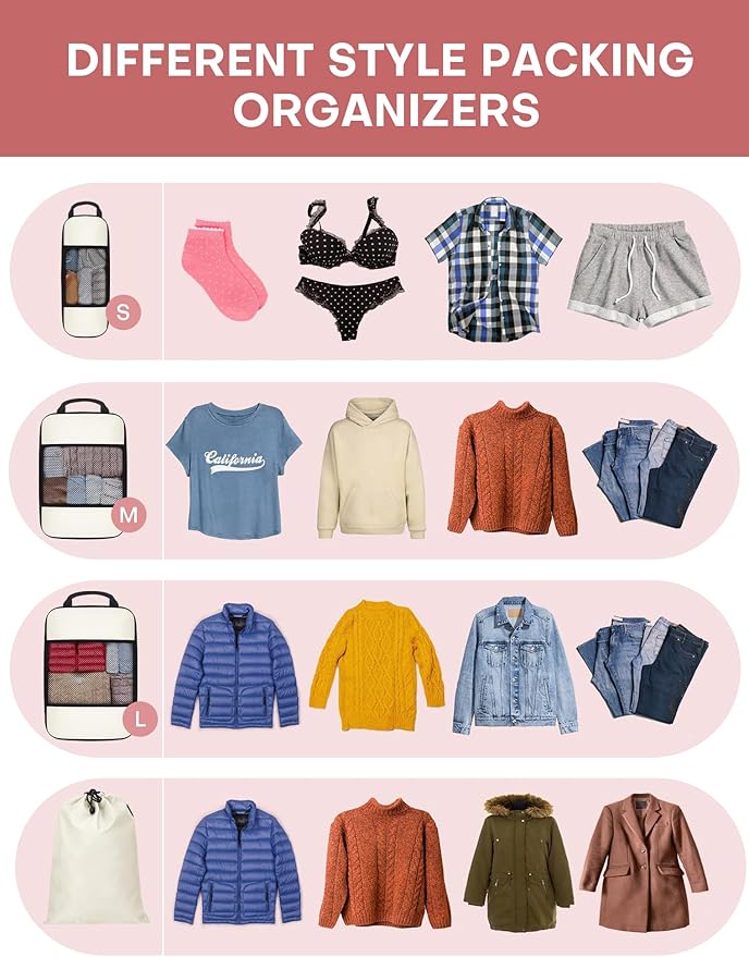 - VERSATILE & FLEXIBLE: Includes 6 pcs organizers for different items: 2 small cubes, 2 Medium cubes, 1 Large cube and 1 drawstring pocket. Moreover, these packing cubes can be used to stay organized at home, while traveling, and are perfect for camping or any outdoor adventure! You can easily fit them into your suitcases, totes, backpacks, duffel bag, etc.