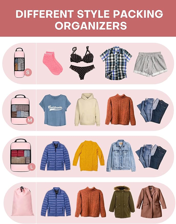 - VERSATILE & FLEXIBLE: Includes 6 pcs organizers for different items: 2 small cubes, 2 Medium cubes, 1 Large cube and 1 drawstring pocket. Moreover, these packing cubes can be used to stay organized at home, while traveling, and are perfect for camping or any outdoor adventure! You can easily fit them into your suitcases, totes, backpacks, duffel bag, etc.