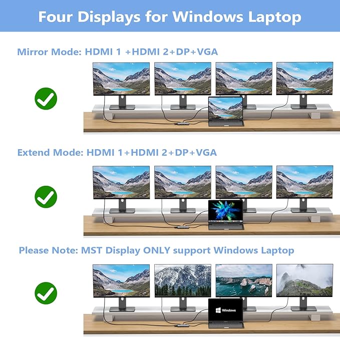 - Docking Station 4K Display Adapter: The Laptop Docking Station with 4 video output ports: 2 HDMI+DP+VGA, can output up to 4K Dual/Triple Display videos; For quadruple display Dual HDMI, DP, and VGA all are 1080@60Hz. Please make sure your laptop specification support DP1.4 signal output. If the VGA port is connected, it will affect the resolution of all displays up to 1080P only