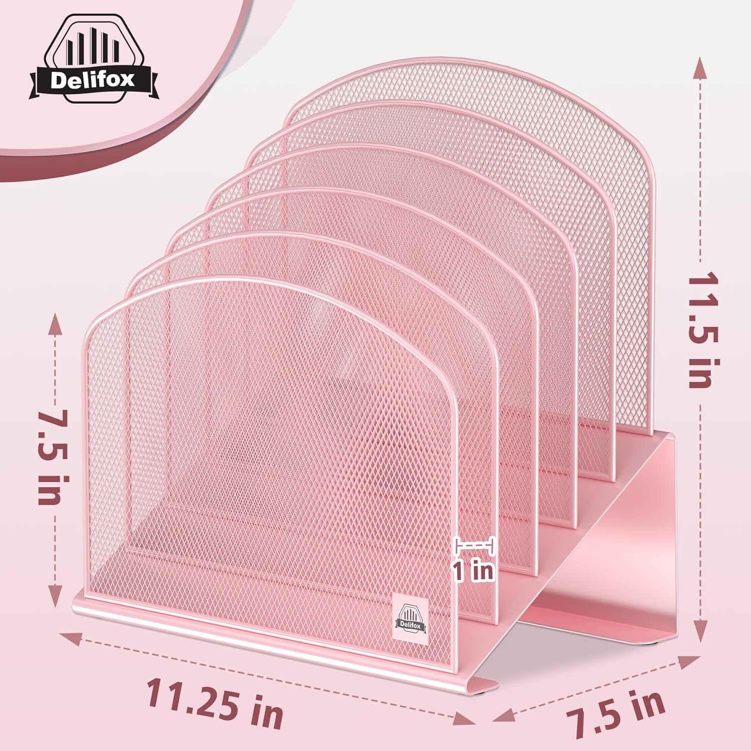 Inclined Desk File Organizer, 5-Section Vertical File Folder Holder Stand Metal Rack File Sorter for Office Classroom Desktop Organization (Pink, 2Pack)