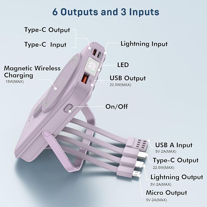 - 【6 Outputs and 3 Inputs】Wireless Portable charger has 6 outputs and 3 inputs, you may charge 6 devices max at the same time, recharge battery pack with 3 input options easily. Magnetic wireless charger built-in 3 output cables and 2 outputs port(1 USB-C port and 1 USB-A port) and 1 magnetic wireless charging (Total 6 outputs), great for multi electronics users who has iPhone, android or micro devices. It also built-in 3 inputs (1 built-in USB-A recharging cord/cable, 1 USB-C input, 1 iPhone input), which you can use any one of them to recharge Magnetic battery pack conveniently.