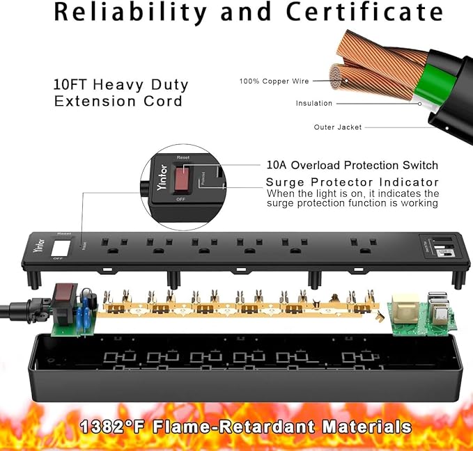 Surge Protector Power Strip (1680J) - Yintar 10Ft Extension Cord with 6 AC Outlets and 3 USB Ports(1USB C) for Home, Office, Dorm Essentials, ETL Listed, Black