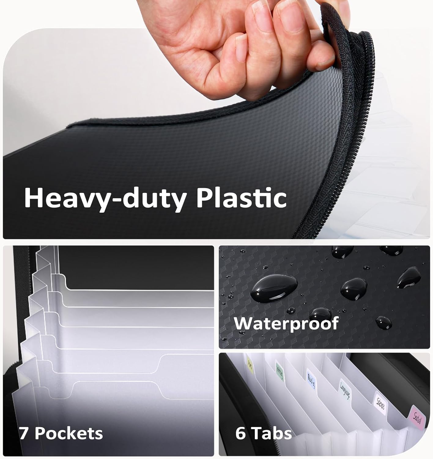 Sooez 7 Pockets Accordion File Organizer, Zipper Expanding File Folder, Heavy Duty Folder Organizer, Sleek Letter Size Accordion Folder, Portable Expandable File Folder, 14 x 11.2 Inch, Black