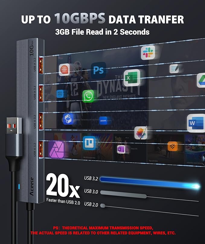 - 【4 Port 10Gbps USB Hub】:Aceele Multi Port USB Hub Expand your one USB 3.2 Gen 2 USB-A port to 4, set aside less time for syncing and more time for play. Managing your USB connections has never been easier.📵Please Note that this hub cannot charge devices.