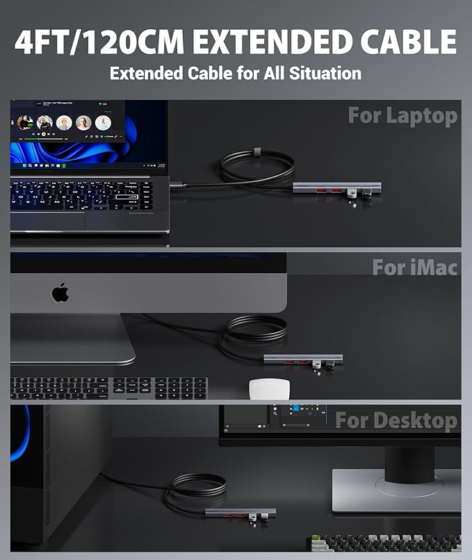 - 【4ft Long Cable + Velcro Closure】: The Computer usb port hub Multiport Adapter With A Cable Length Of 4ft/120 Centimeters, The Hub Can Be Easily Used With Desktop Pcs, And Has Velcro Closures To Organize Excess Cables.
