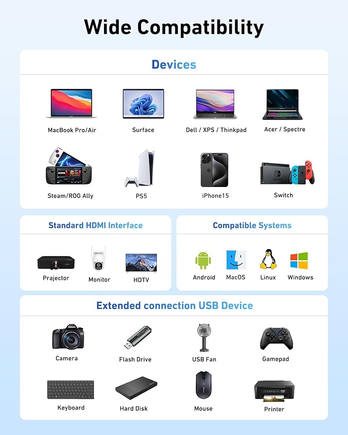 - Wide Compatibility: Encased in a high-quality aluminum housing for enhanced durability and heat dissipation, this USB adapter offers wide compatibility with various devices, including laptops, tablets, and smartphones. Designed for use with MacBook Pro, MacBook Air, Acer, XPS, laptops, tablets, Switch, Steam, this USB C adapter functions seamlessly across multiple operating systems, including Windows, ChromeOS, Linux, and Mac OS X 10.5 or higher.