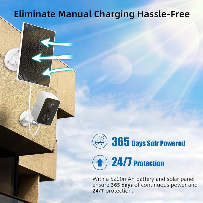 - 【100% wireless with Solar Panel】 The Outdoor Solar security camera with built-in 5200 mAh battery, it can be charged with a solar panel to work day and night. The wireless design ensures easy and flexible installation. 100% wireless outdoor camera surveillance.