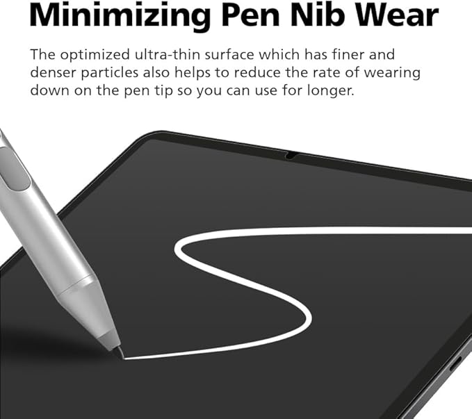 - 【FEELS LIKE WRITING & DRAWING ON REAL PAPER】 The premium paperfeel texture of surface makes you feel like paper, providing you with a wonderful and delicate writing and painting experience. Also it provides more resistance on the touchscreen than normal tempered glass which gives you more control and accuracy when drawing. The optimized ultra-thin surface which has finer and denser particles also helps to reduce the rate of wearing down on the pen tip so you can use for longer.