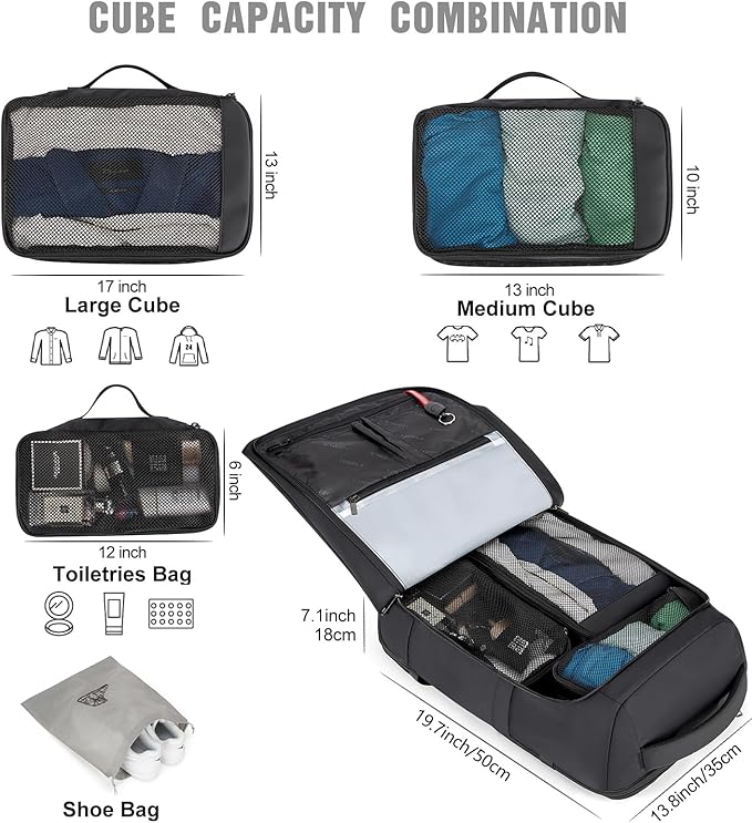 - [Convenient & Organized] Extra Custom-Made 3 Storage Bags & 1 Large Shoes Bag can accommodate lots of stuffs like college supplies, travel accessories, clothes, stationery, cord organizer, toiletries, shoes etc to store your item in an organized manner and easier to find. The interior of the backpack is specially designed to separate dry and wet areas, and wet towels and clothes that are not dry are used, which will not affect other items. Backpack dimensions are 19.7x13.8 x7.1in/50x35x18cm.
