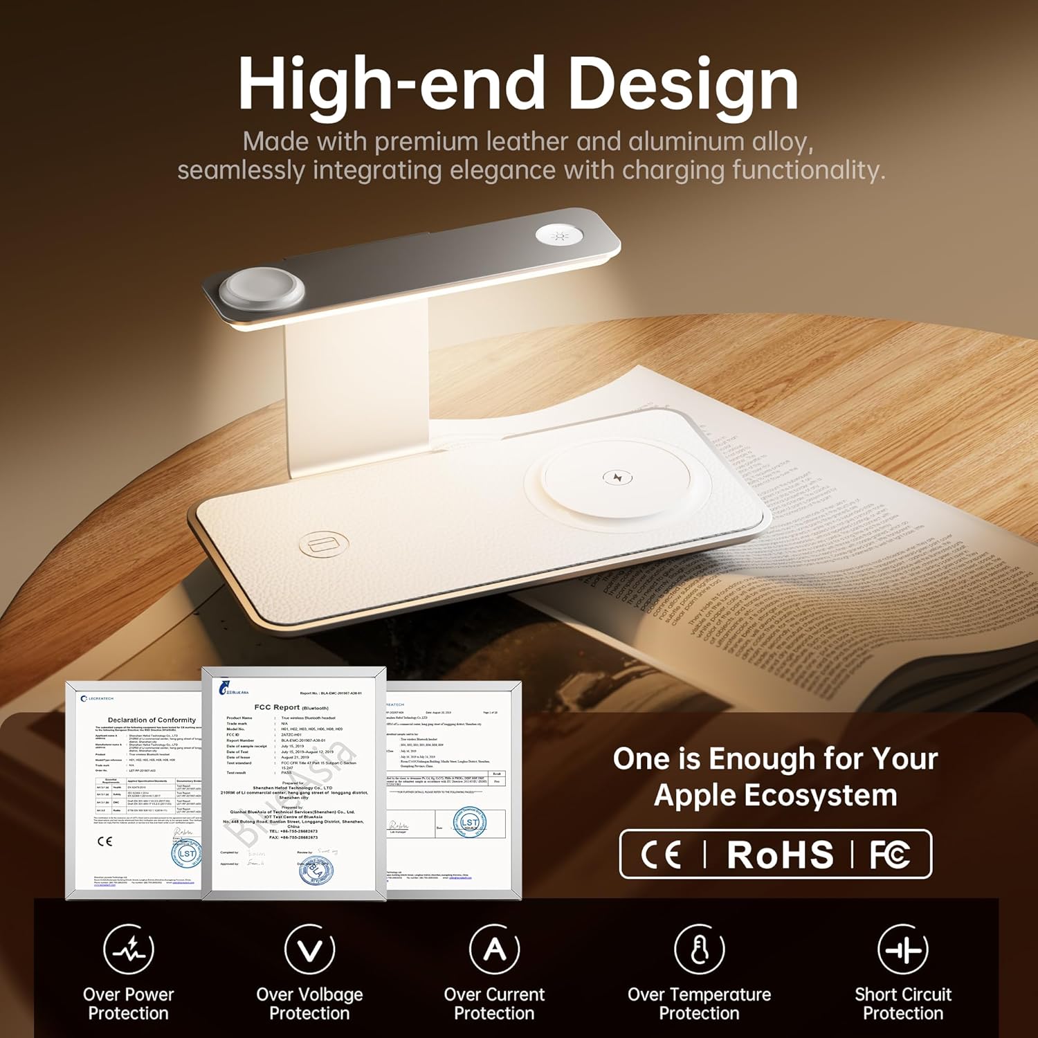 - Metallic Exterior: This charger adopts a sturdy metal exterior, making it resistant to drops and impacts. The charging panel for the watch is covered with leather, ensuring durability and providing a non-slip surface. Power up the Phone 15/14/13/12 series in a snap at up to 15W high-speed charging with seamless magnetic alignment.