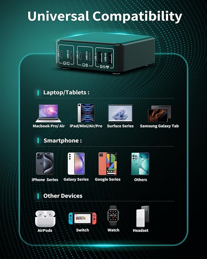 - 【130W Super-Fast Charging – More Power, Less Waiting】65W USB-C (C1/C2): Charge your MacBook Pro 13” to 50% in just 30 minutes.45W USB-C (C3/C4): Boost your iPhone 16 Pro Max from 0 to 50% in only 25 minutes. Total 130W Output – Ensures simultaneous fast charging for multiple high-power devices. Designed for busy professionals, students, and families who need quick, reliable charging throughout the day.