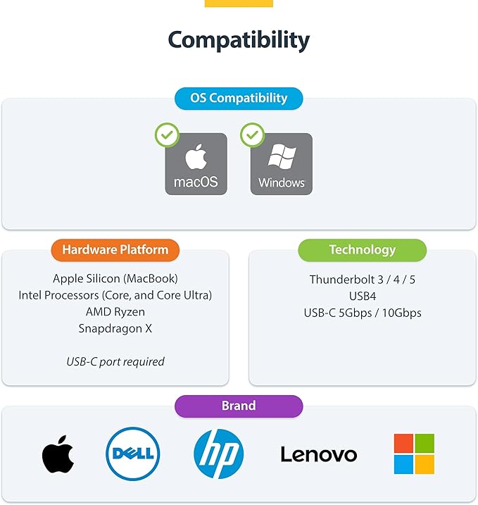 - UNIVERSAL USB4 AND THUNDERBOLT DOCK : This high-performance dock offers driverless compatibility with Windows and macOS; Designed to work with Intel, Apple Silicon, AMD, Snapdragon X Copilot plus PCs, it's ideal for mixed-device fleets and laptop refreshes