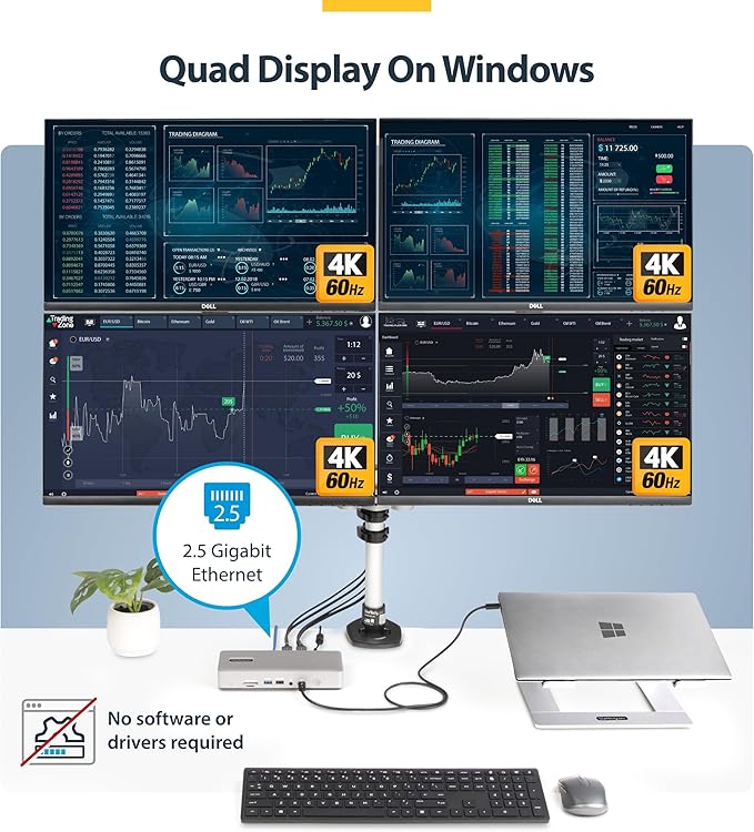 - QUAD DISPLAY ON WINDOWS : Enables up to four 4K 60Hz monitors when connected to Windows laptops with Intel 12th Gen CPUs (or later) and DP 1.4 with DSC; Also supports triple or dual displays on older systems without DSC