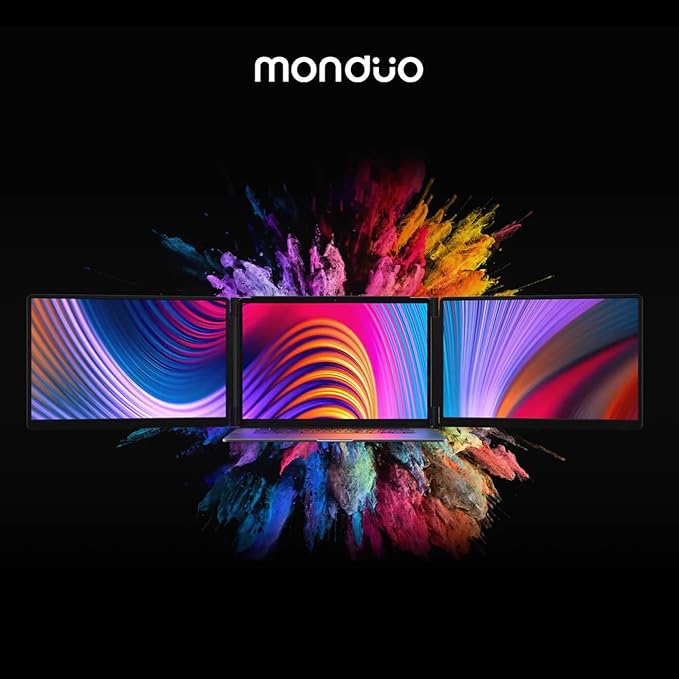 - Adjustable Ergonomic Stand: Features a heavy-duty built-in, tiltable stand with up to 180ยฐ adjustment across a 38.8 cm width, providing flexible viewing angles for comfortable use at desks, meetings, or during travel. The stand holds the weight of the monduo screens and won't effect the hinge of your laptop.