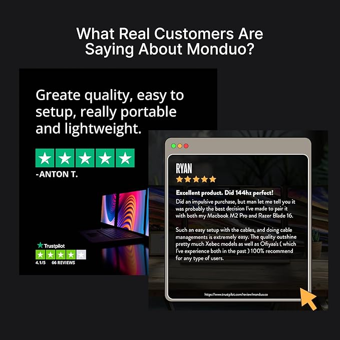 - Broad Compatibility with Easy Setup: Seamlessly integrates with 16" MacBook Pro M1-M4, 16" MacBooks with Thunderbolt 3 ports (2019+), and 16" PC laptops with two USB-C/Thunderbolt ports or two USB-C/Thunderbolt and one HDMI port, supporting versatile connectivity.(Note: Some models or systems with limited dual-screen support may not be compatible. Please check your device specifications before purchase.) Contact us and we can let you know if the Monduo is compatible with your device!