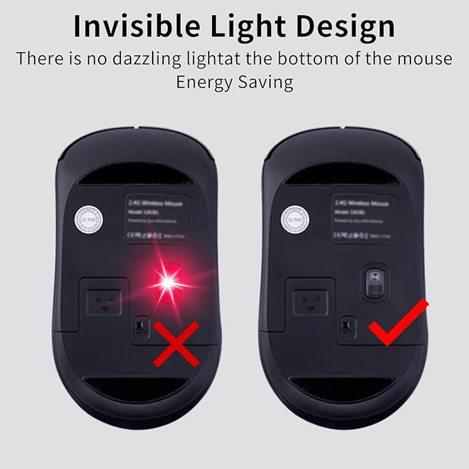 - 【Mouse with No Light Design】- The wireless mouse features a lightless design without any strong and glaring red light at the bottom. You don’t have to worry about discomfort in your eyes caused by strong light, which is especially friendly for curious kids