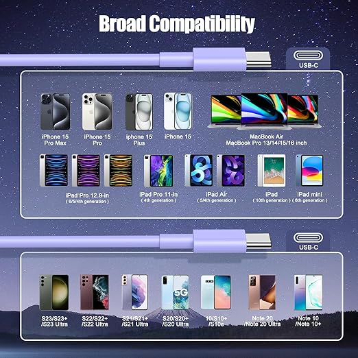 - 【Universal Compatibility】This C to C fast charging cable Compatible with 65W/61W/45W/35W/30W/25W/20W USB C charger.for iPhone Air 17 16e 16 15 Pro Plus Pro Max,for iPad Pro, for iPad Air, for iPad Mini ,for MacBook Pro, for Macbook Air , for Galaxy S25/24/S23/S22/S21, for Galaxy A56/A55/A54/A53,for Galaxy Z Flip7 FE, for Galaxy Z Fold7/6/5,for Galaxy Z Flip7/6/5,for Galaxy W25/W24/W23, for Google Pixel 10/9/8/7/6/5/4/3,for Switch, for PS5 and other USB-C port devices.