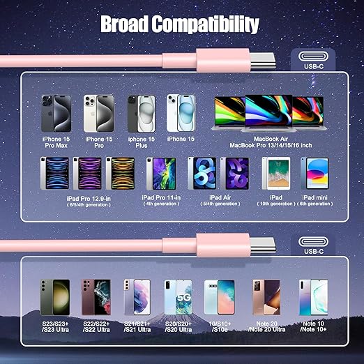 - 【Universal Compatibility】This C to C fast charging cable Compatible with 65W/61W/45W/35W/30W/25W/20W USB C charger.for iPhone Air 17 16e 16 15 Pro Plus Pro Max,for iPad Pro, for iPad Air, for iPad Mini ,for MacBook Pro, for Macbook Air , for Galaxy S25/24/S23/S22/S21, for Galaxy A56/A55/A54/A53,for Galaxy Z Flip7 FE, for Galaxy Z Fold7/6/5,for Galaxy Z Flip7/6/5,for Galaxy W25/W24/W23, for Google Pixel 10/9/8/7/6/5/4/3,for Switch, for PS5 and other USB-C port devices.