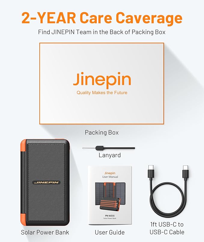 - 【Thanks for choosing JINEPIN】 You’ll get 1 x solar charger 46800mAh, 1 x c-to-c charging cable, 1 x lanyard, and 1 x user manual, all contained in a nice gift box. Every JINEPIN product is certified safe and provided with a 2-year warranty. We also provide professional pre-sales and after-sales service for you. Any questions, please don’t hesitate to contact us. We promise you a satisfactory solution within 24 hours.