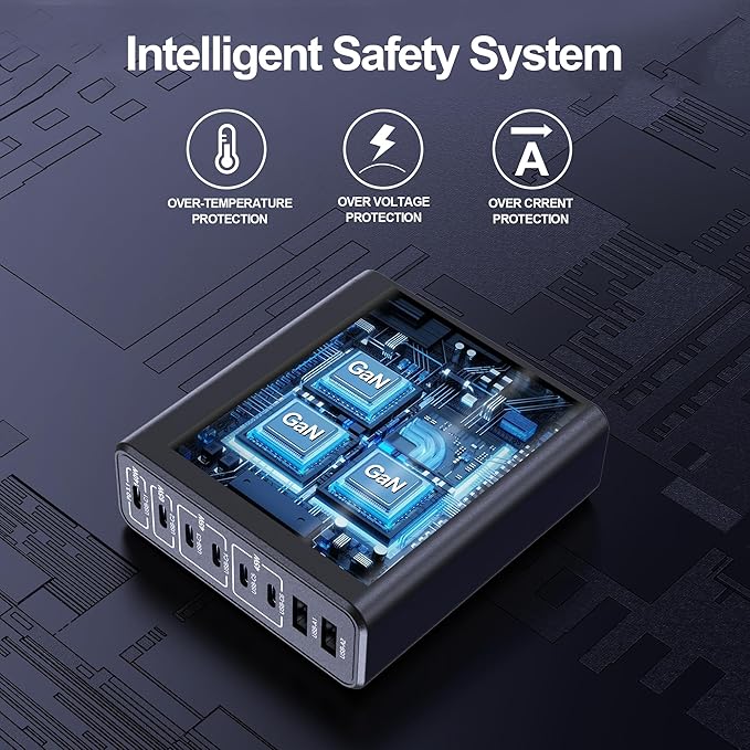 - 8 in 1 USB C Charging Station: With 6 USB-C ports and 2 USB-A ports, say goodbye to tangled cables and cluttered desktop, meet all your daily fast charging needs. USB-C1 140W / USB-C2 65W port can power your laptops like for MacBook Pro/Air. Other ports can provide 45W, 30W or 20W are strong enough to fast charge for iPhone 15 Pro Max, iPad, Samsung Galaxy S23 Ultra and more simultaneously without waiting time