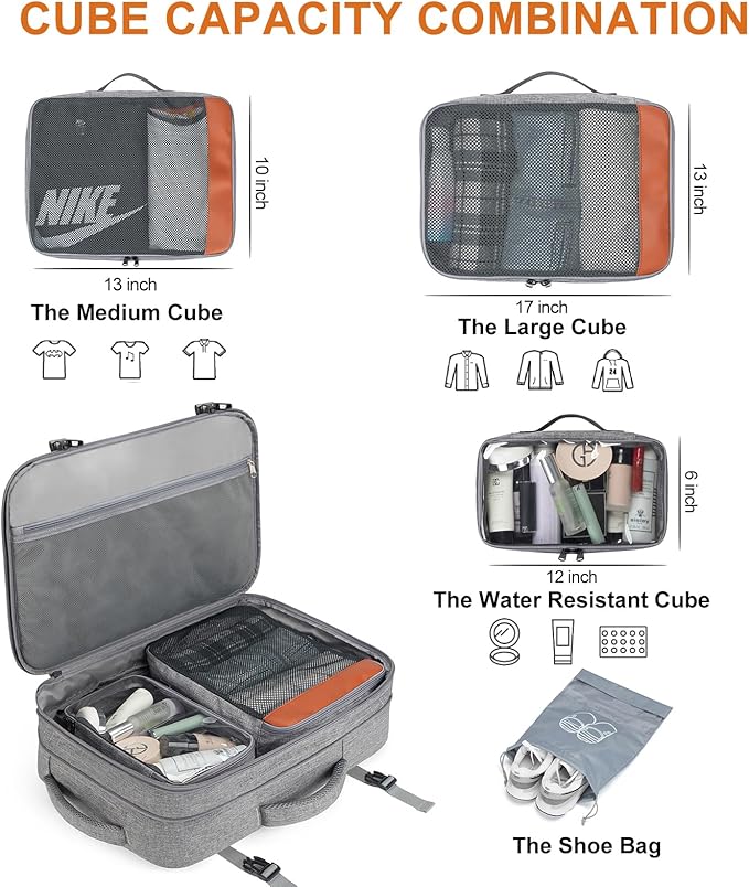 - EXTRA 3 PACKING CUBES+1 SHOE POCKET:This weekend travel backpack comes with three packing cubes. large cube and medium cube for clothes, personal item. Small water resistant cube with transparent side for providing clear overview of Toiletries. there's also a shoe pocket. Keeping your belongings neater and more organized. Serve you well as carry on bags for airplanes, weekender backpack, personal item travel bag, overnight bag