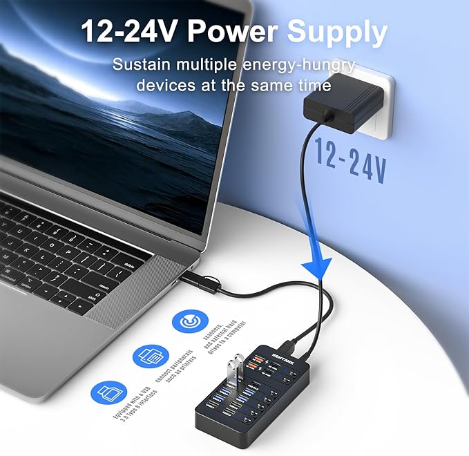- 【Stable Power Supply & Convenient LED Individual Switches】DC Power Supply (12-24V) ensures a reliable and stable power source for your hub and connected devices. Overcurrent, overvoltage, and short circuit protection ensure the safety of your devices and data. LED Individual Switches allow for easy control and management of individual ports, reducing power consumption and enhancing device safety. Backed by a 1-year warranty and customer support for peace of mind.