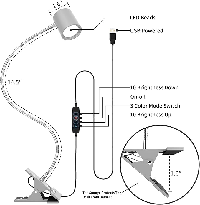 - Better Illumination Effects - The clamp desk light provides high CRI (90+) LED beads, brings you a clear and bright lighting effect while also restoring the color of an object.Bed reading light comes with a 4.9 ft USB cable that can be easily plugged into any available USB port to power the lamp (Adapter not include)