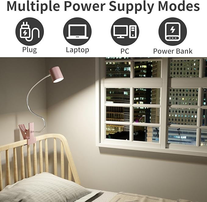 - Better Illumination Effects -The clamp desk light provides high CRI (90+) LED beads, brings you a clear and bright lighting effect while also restoring the color of an object.Bed reading light comes with a 4.9 ft USB cable that can be easily plugged into any available USB port to power the lamp (Adapter not include)