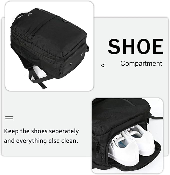 - Versatile & Convenient: External USB port with built in charging cable conveniently charges your phone and other electronic devices (pls provide your own portable charger). The shoe compartment at the bottom fits sizes 10-12, keeping footwear separate and odors at bay with breathable venting holes, while doubling as a versatile toiletry or accessory bag. This large travel backpack ensures essentials stay neat, accessible, and travel-ready—perfect for business trips or adventures
