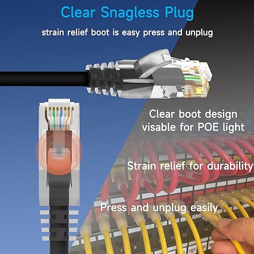 - Clear Snagless Plug: Network patch cables are made of clear tap Snagless plug with strain relief boot for maximum durability. Cat6 patch cords with snagless plug is easy press and unplug. Clear boot of cat6 patch cable allows to see the light of the POE ports easily.