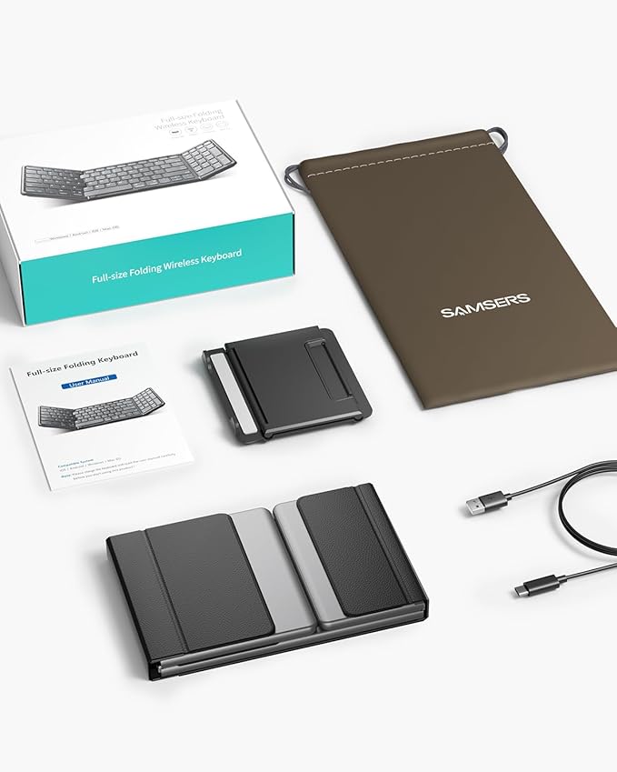- 【Little Things & Big Convenience】 Samsers portable folding keyboard, only 9.3 ounces. Palm-sized keyboard can be folded up magnetically and put in your briefcase without taking up much space. Maximum convenience for you with minimum weight and size! Comes with a phone stand and a velvet storage bag, the perfect companion for a folding keyboard. Not just a keyboard, but a travel solution!