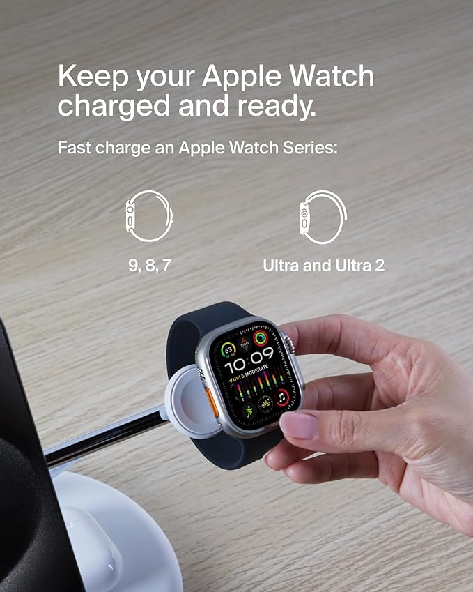 - 3-IN-1 LIGHTNING-FAST CHARGING: Place your phone on this stand for up to 15W fast charging Qi2 for iPhone plus MagSafe compatibility, even with a case up to 3mm on. Plus, get 5W of simultaneous fast charging for AirPods and Apple Watch Series.