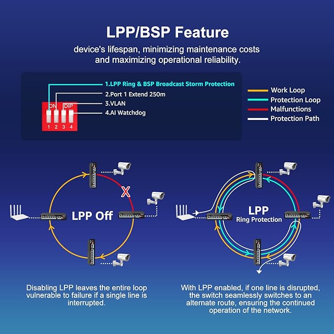 - ๐AI Watchdog Mode - This enhanced 10-Port PoE switch features AI Watchdog Mode. This advanced functionality automatically detects and rectifies port issues, guaranteeing uninterrupted power delivery to all connected devices. Elevate your network's security and reliability with seamless operation, ensuring unparalleled performance for your infrastructure.