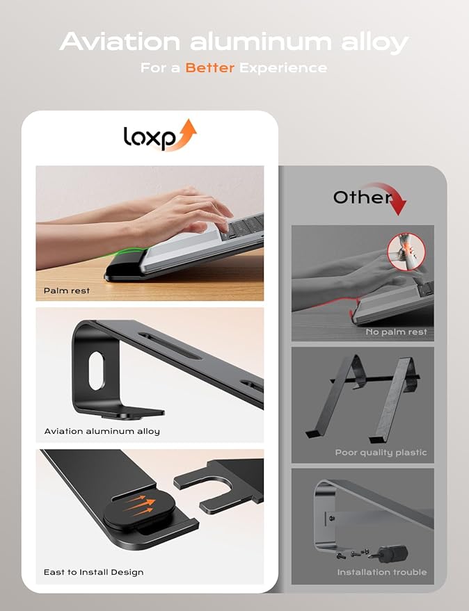- [Solid and Sturdy Metal Stand] - This laptop wrist support is designed by engineers of loxp based on the concept of triangle stability. Three different force points provide strong support for your laptop device. All three sides are made of durable and tight aluminum alloy material. It is detachable and does not require screws. It is easy to assemble and disassemble. You can use it as a travel laptop stand because it is easy to carry.