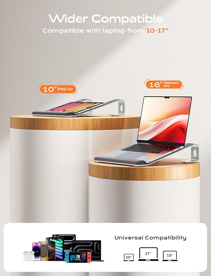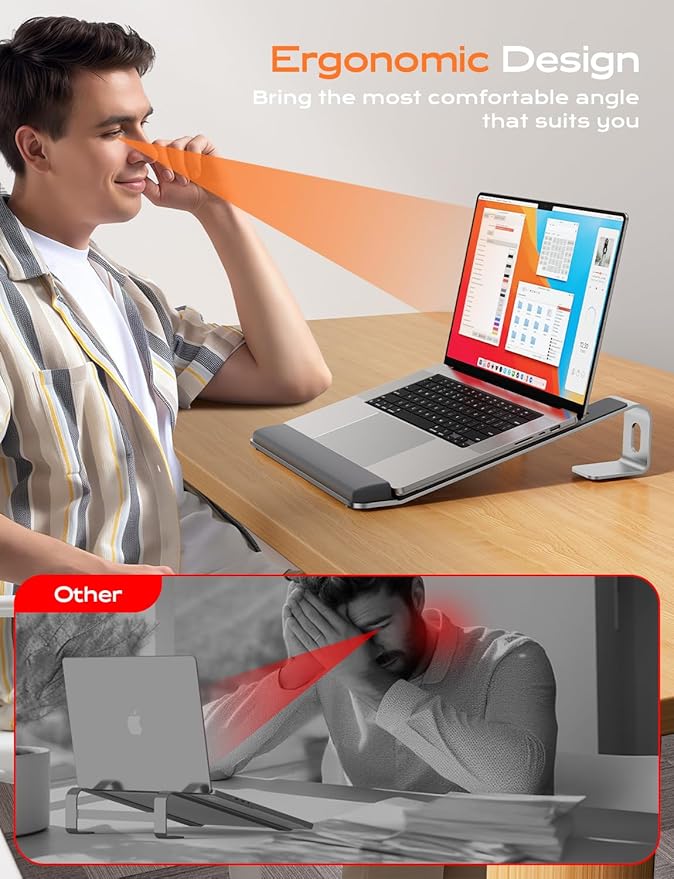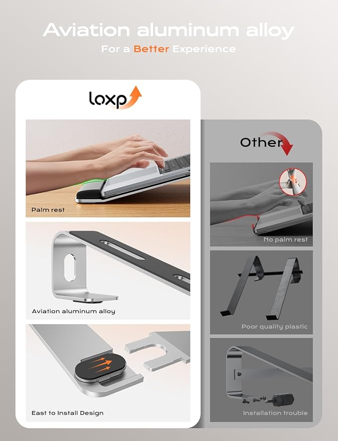 - 【Non-slip and shockproof & safe and stable】LOXP computer stand has large rubber pads, distributed on the upper and bottom of the computer stand for desk, to prevent the laptop from falling and scratching your arm or the table; making LOXP computer stand for laptop very suitable for office desks, kitchens, cafes, utility rooms and even anywhere. The powerful rubber pads provide strong friction to keep your device stable at all times.